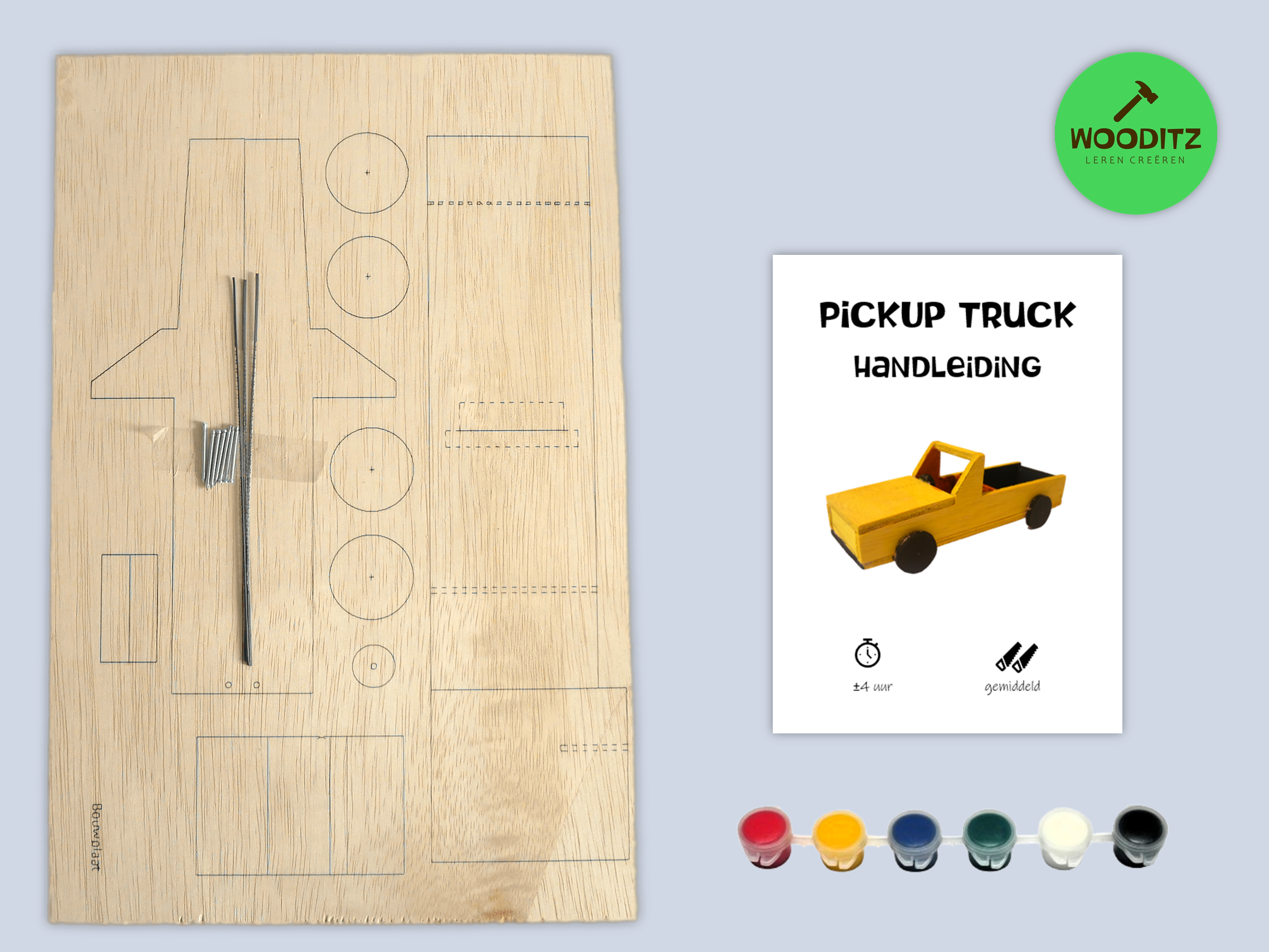 Met de bouwpakketten van Wooditz leren kinderen zagen, schuren, lijmen, spijkeren en verven. Hierdoor ontwikkelen ze hun motoriek, ruimtelijk inzicht, creativiteit en zelfstandigheid. De onderdelen worden uitgezaagd met de figuurzaag. Daarna worden alle onderdelen netjes opgeschuurd. Vervolgens zetten ze het model in elkaar d.m.v. lijm en/of spijkers. De laatste stap is het verven van het model, zodat er een unieke creatie ontstaat. Een geweldige ervaring voor ieder kind!